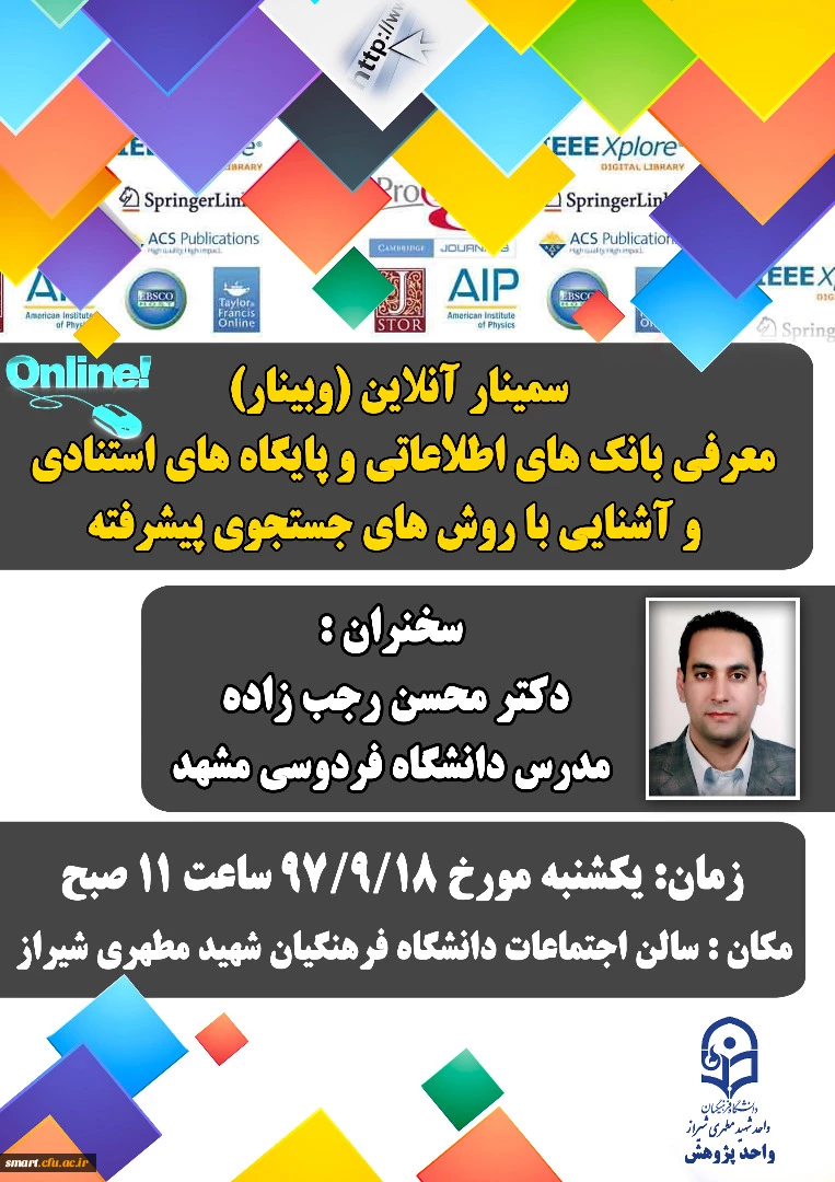 امتیاز دهید : وبینار 04-معرفی بانک های اطلاعاتی و پایگاه های استنادی و آشنایی با روش های جستجو 2 چهارشنبه 2 آذر 1401 ساعت 11:46